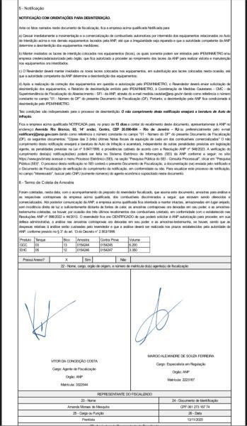 Diante da irregularidade, a ANP lavrou auto de interdição do bico 13, como medida cautelar prevista na Lei 9.847/1999. O equipamento foi lacrado, e o posto foi notificado de que a violação do lacre pode resultar em novas sanções.