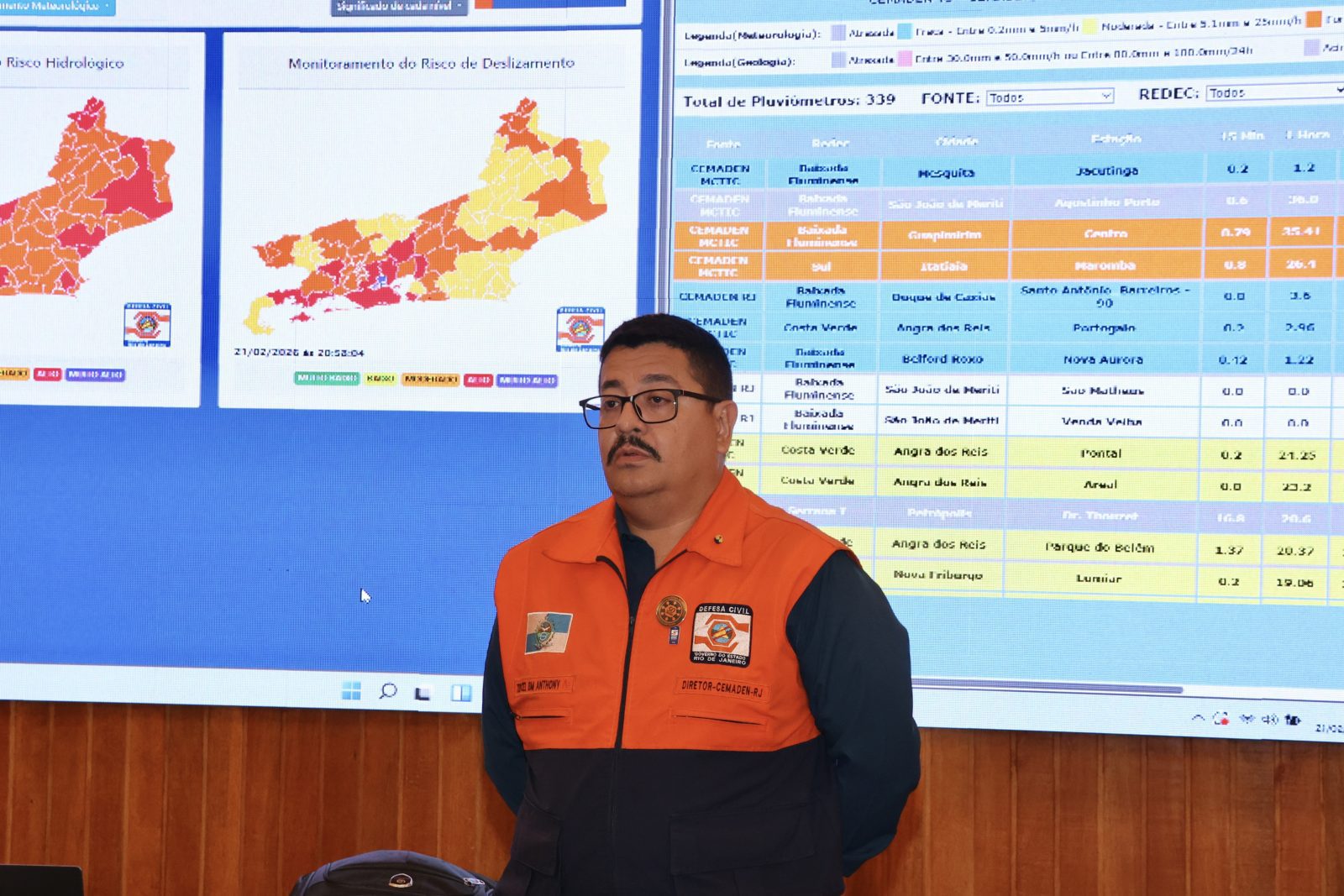 O governador Cláudio Castro esteve, neste sábado (21/02), no Quartel Central do Corpo de Bombeiros para acompanhar pessoalmente, da sala de crise, a situação das fortes chuvas que atingiram o estado. Até o momento, 47 ocorrências foram atendidas pelos militares. O gabinete de crise permanecerá ativo durante toda a madrugada, com monitoramento em tempo real das condições meteorológicas e das ocorrências em todo o território fluminense.