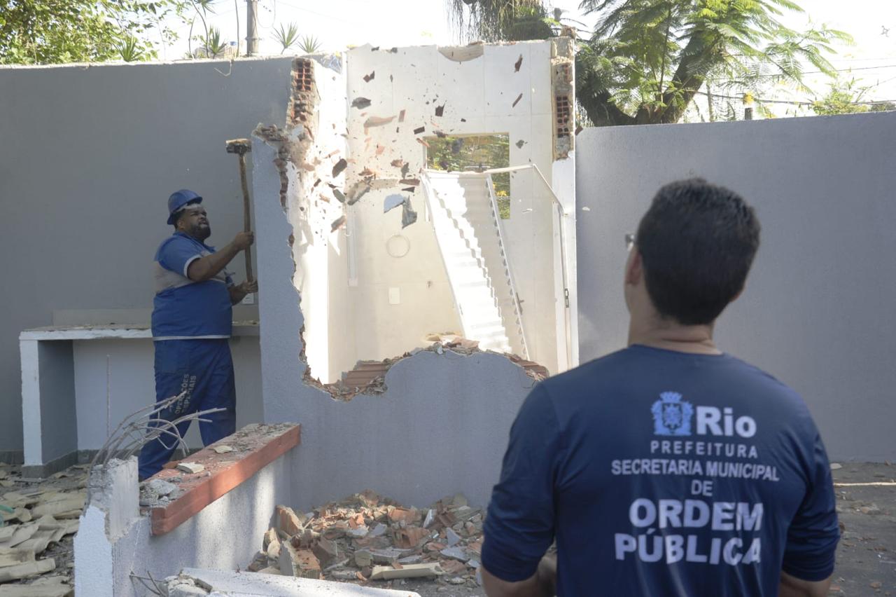 Secretaria Municipal de Ordem Pública (SEOP) realiza, na manhã desta quarta-feira (28/01), a demolição de duas construções irregulares na Rua Arroio Fundo, no interior do Condomínio Serviços D’Aldeia, no Anil, Zona Sudoeste do Rio, após denúncia de moradores. As obras, com uma área de aproximadamente 150 m², serviriam como espaço comum do condomínio, com planos de construção de sede administrativa, área gourmet, salão de festas e espaço para eventos.