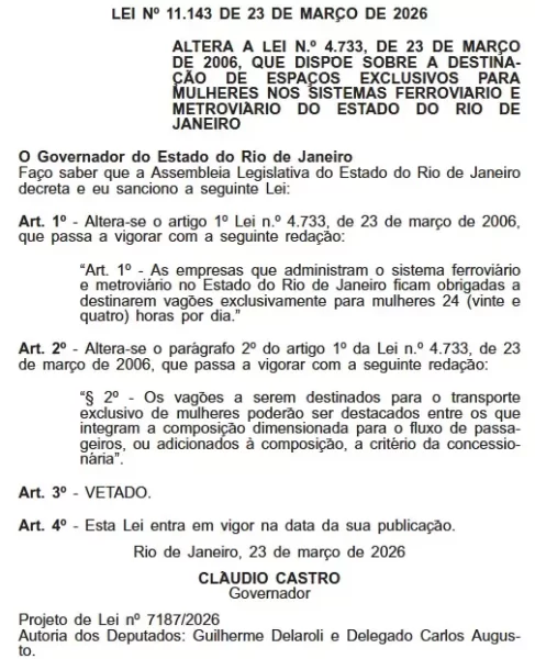 Entrou em vigor nesta segunda-feira (23) a lei que determina o funcionamento dos vagões exclusivos para mulheres durante 24 horas por dia nos trens e no metrô do estado do Rio de Janeiro. A norma foi sancionada pelo governador Cláudio Castro e publicada em edição extraordinária do Diário Oficial.